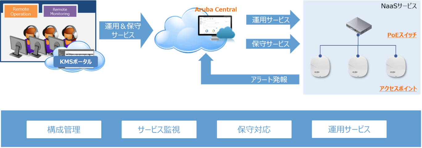 あわせてクラウド型管理システムを提供する日本ヒューレット・パッカード合同会社 Aruba事業統括本部(以下、Aruba)の「Aruba Central」を利用することで、機器をクラウドベースで統合管理・監視することが可能になり、当社エンジニアが運用・保守サービスをご提供します。
