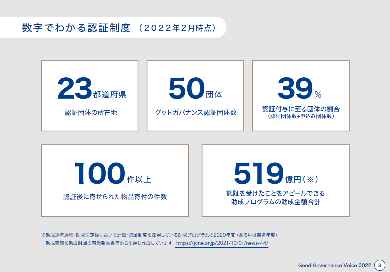 (一財)非営利組織評価センター(以下、JCNE)は2022年3⽉16⽇(⽔)、グッドガバナンス認証を取得した49団体の活動を紹介するガイドブック『Good Governance Voice2022』を発⾏しました。