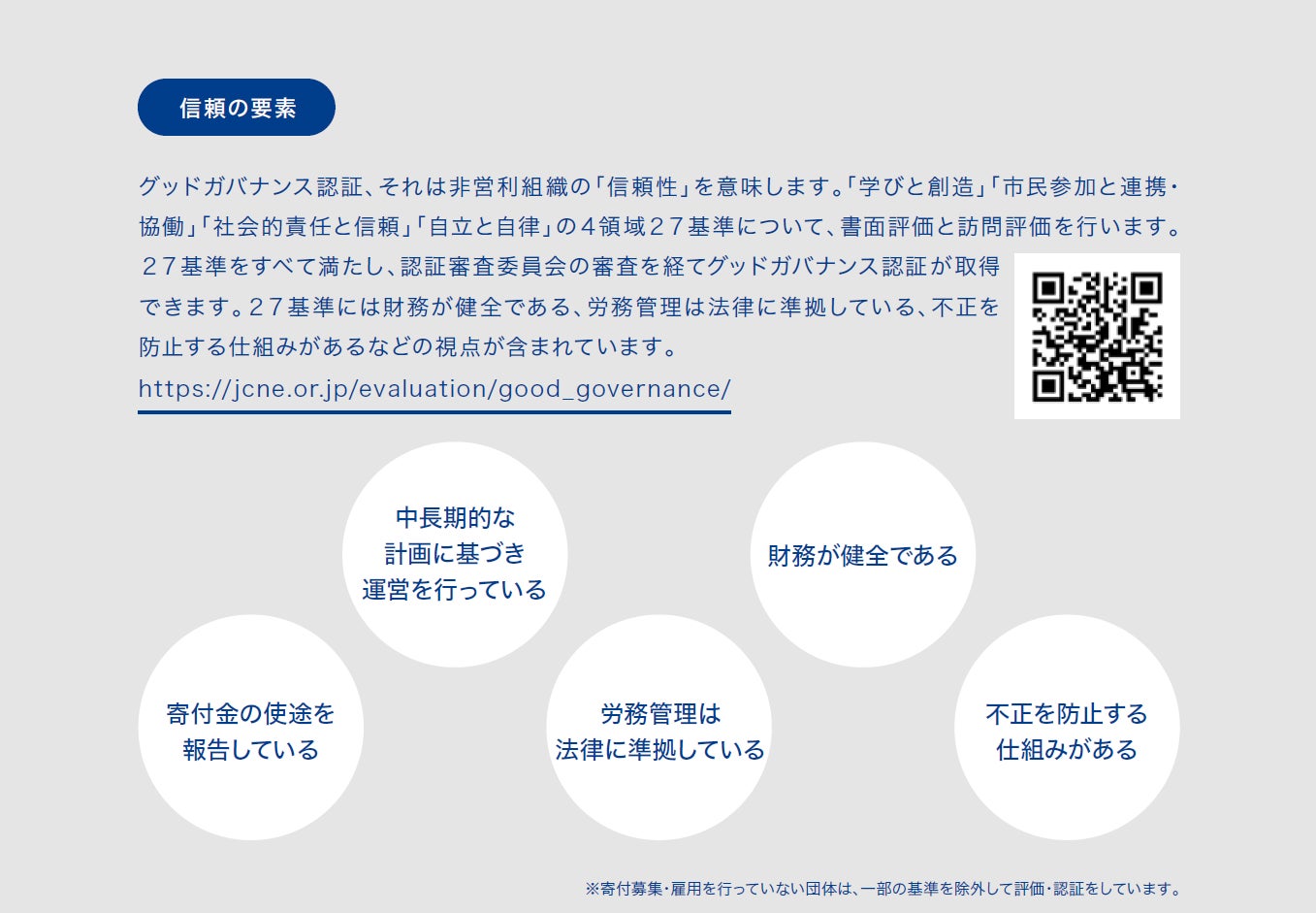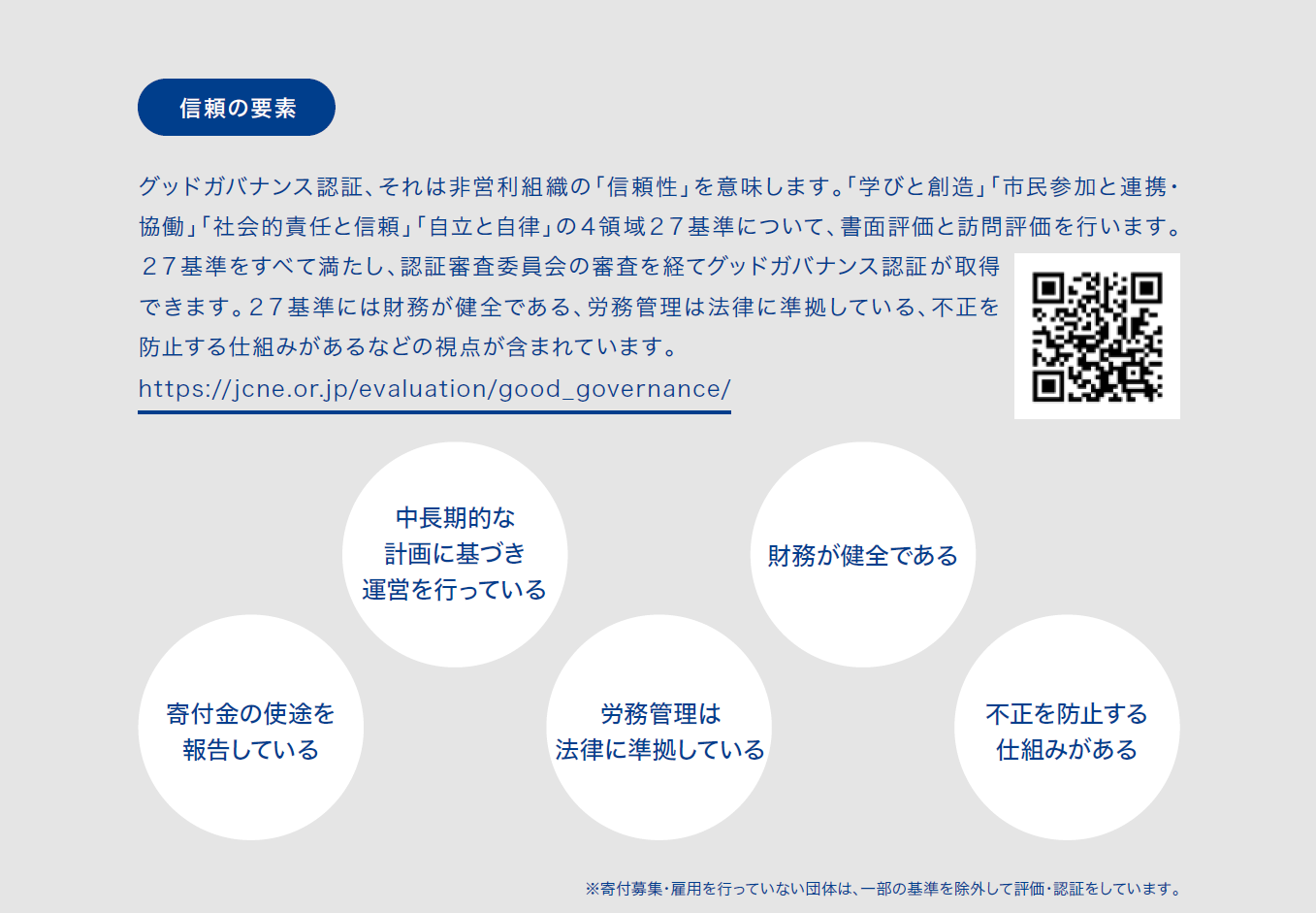 グッドガバナンス認証は、非営利組織の「信頼性」を意味します。「学びと創造」「市民参加と連携・協働」「社会的責任と信頼」「自立と自律」の4領域27基準について、書面と評価員による訪問評価によって判断します。この27基準を満たし、外部委員で構成された認証審査委員会を経てグッドガバナンス認証が取得できます。