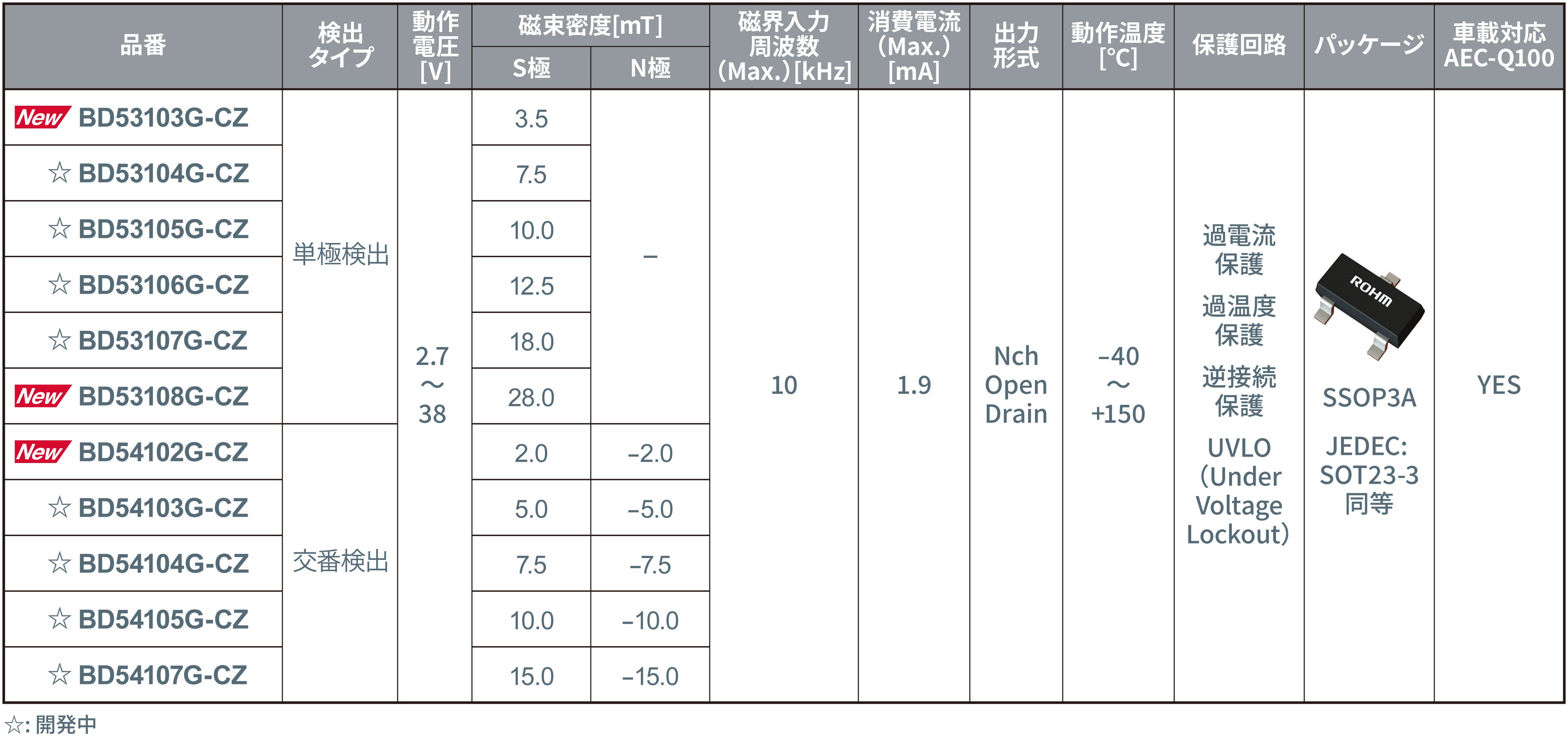 BD5310xG-CZ / BD5410xG-CZシリーズは、用途に応じてさまざまな製品を選択できるよう、単極検出(*1)タイプのBD5310xG-CZシリーズと、交番検出(*2)タイプのBD5410xG-CZシリーズの2シリーズを用意。検出磁束密度(*3)は2.0mT~28.0mTまでの合計11機種をラインアップしていきます。単極検出タイプはドアの開閉やドアロックのなどの位置検出用途に、交番検出タイプはパワーウィンドウやスライドドアなどで使用される各種モータの回転検出用途に最適です。