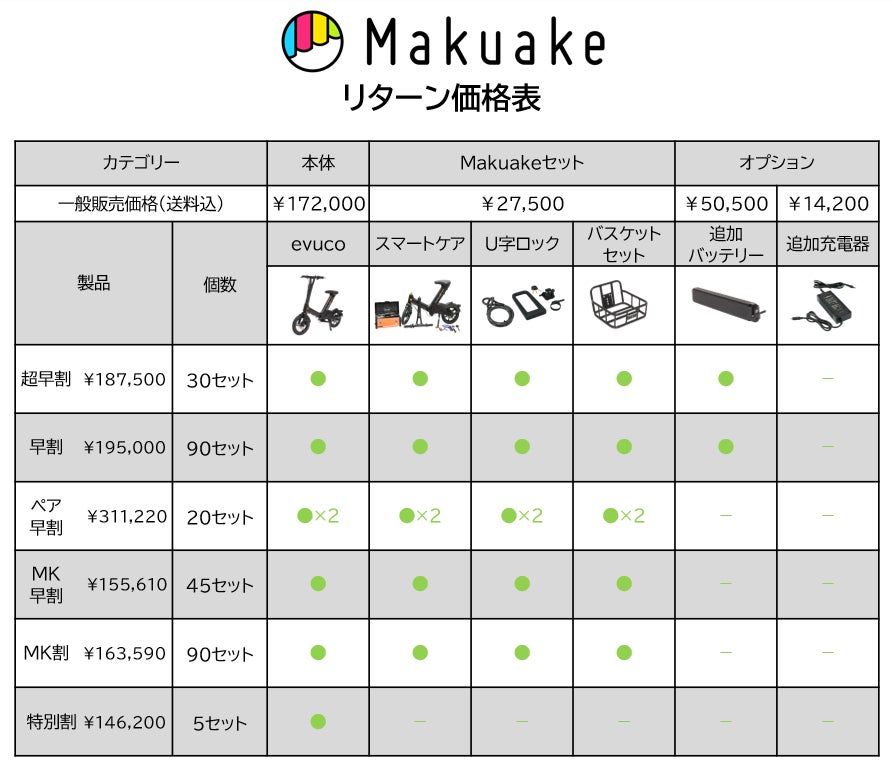 一般販売価格(送料込)は本体172,000円、Makuakeセット27,500円、追加バッテリー50,500円となっています。Makuakeでの販売では、超早割187,500円(Makuakeセット+追加バッテリー付き・30セット)をはじめ、段階的な割引価格を設定しています。