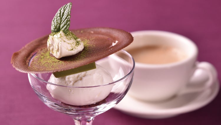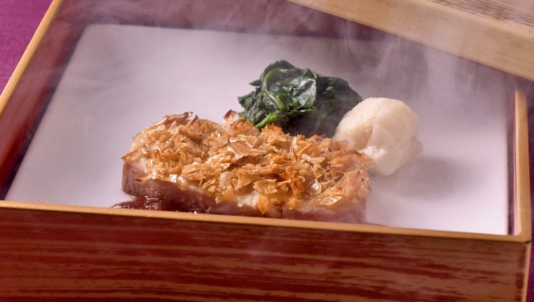 メインは、その日の質のいいものを仕入れるブランドポークを、62℃の低温で3時間じっくりと加熱することで柔らかく仕上げ、更にサクサク食感の湯葉の高温ローストをあわせ、芳醇な香りの「瞬間スモーク」でお愉しみいただきます。