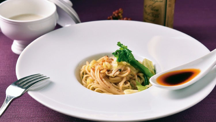 色どり豊かな前菜の盛り合わせにはじまり、つづいて「春の味覚と黒墨見立てのペペロンチーノ」に、「後追い豆乳出汁」をかけてスープパスタ風でお召し上がりいただく、一皿で二度お愉しみいただけるパスタを。