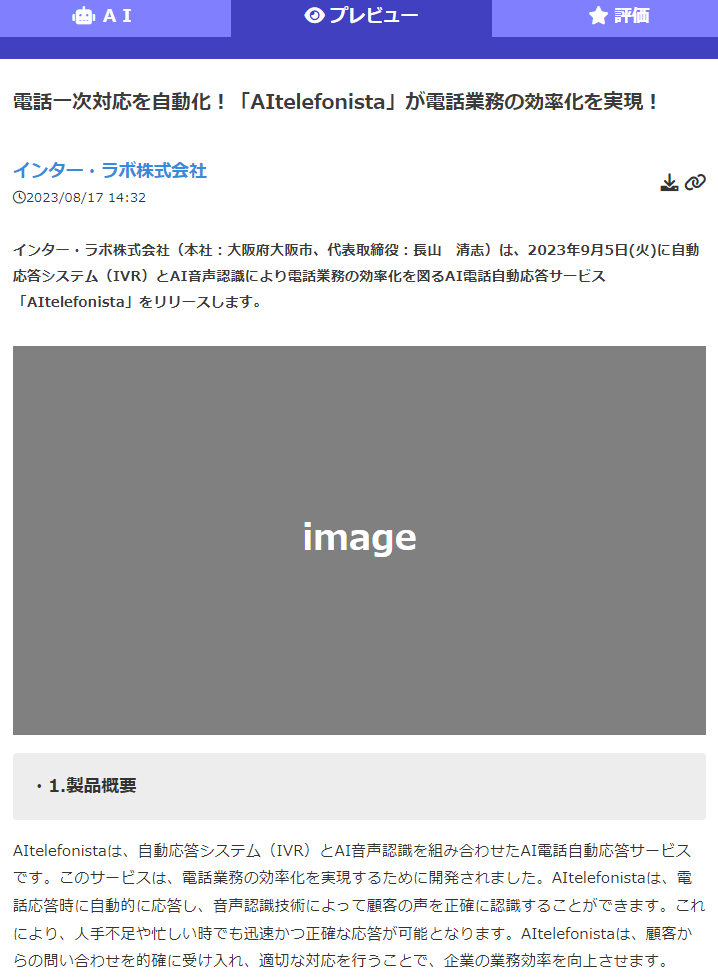 自動生成により、今まで時間のかかっていたプレスリリース作成業務を大幅に効率化します。