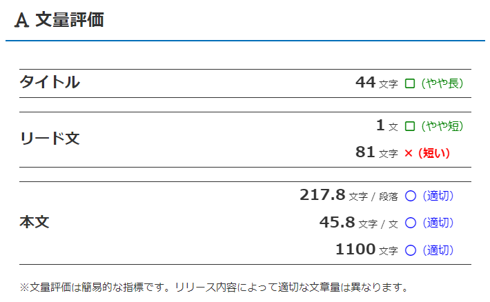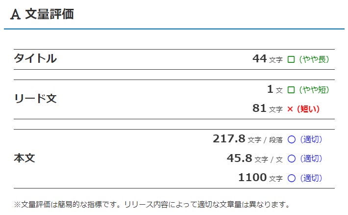 文量評価機能により、タイトル・リード文・本文のそれぞれの文量を評価します。リリース内容に合わせた適切な文量を提示することで、プレスリリース作成において最適な長さを簡単に把握できます。情報の過不足を調整し、プレスリリースの品質を向上をサポートします。