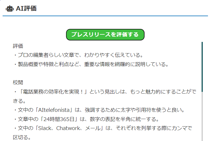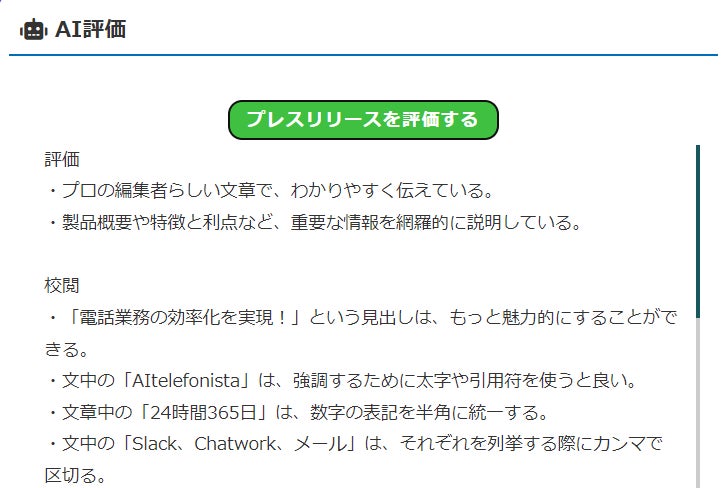 AIによる内容評価機能により、AIが文章の内容を的確に分析し、情報の正確性や伝達効果を評価します。修正点がすぐさまわかり、見出しや本文の表現をより効果的な文章に改善することが可能です。この機能により、専任の担当者でなくとも、正確でより魅力的、効果的なプレスリリース文章の作成を可能にします。