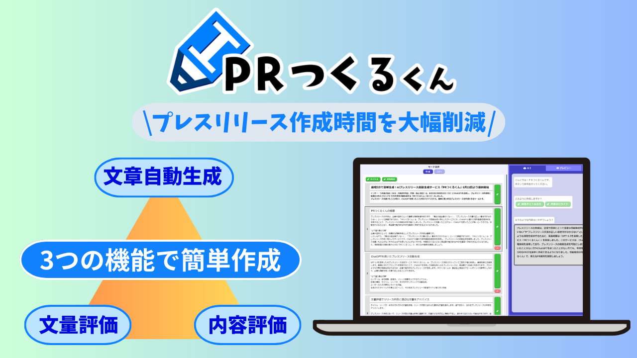 プレスリリース作成は、企業や団体にとって重要な情報発信手段ですが、「専任の担当者がいない」、「作成に時間がかかる」、「プレスリリース文書の書き方が分からない」といった悩みや、課題があります。「PRつくるくん」は、そういった課題を解決するプレスリリース作成に特化したサービスです。ChatGPTの優れた自然言語処理技術を活用することで、プレスリリースの自動生成を可能にしました。昨今、文章を自動生成するAIツールは増えてきていますが、「PRつくるくん」は文章生成だけでなく、タイトル考案、段落構成提案や、文量評価、内容評価まで、プレスリリース作成における業務を一気通貫し、効率化を図れます。プレスリリースを書いたことがない、ChatGPTを使ったことが無いという方でも、手間をかけず、高品質で魅力的なPR文を素早く作成することが可能です。情報発信の効果を最大化する「PRつくるくん」で、新たなPR戦略を展開しましょう。