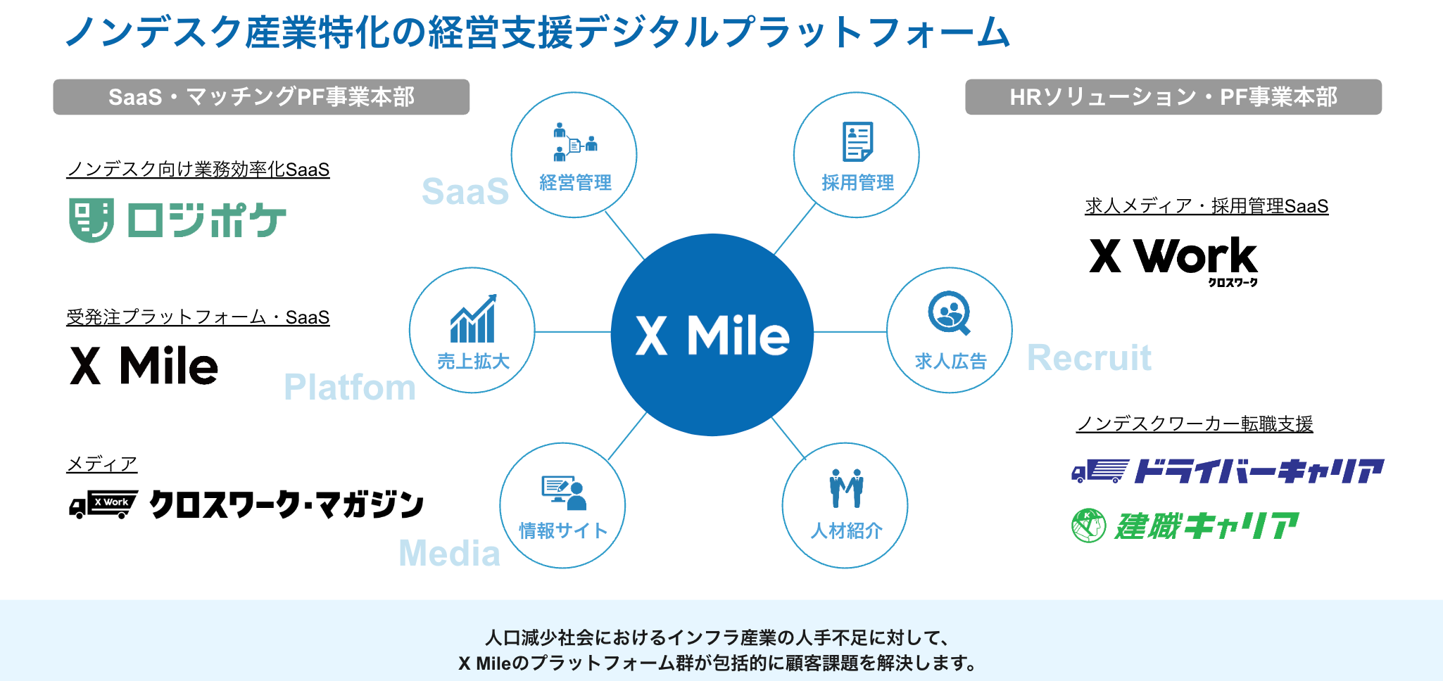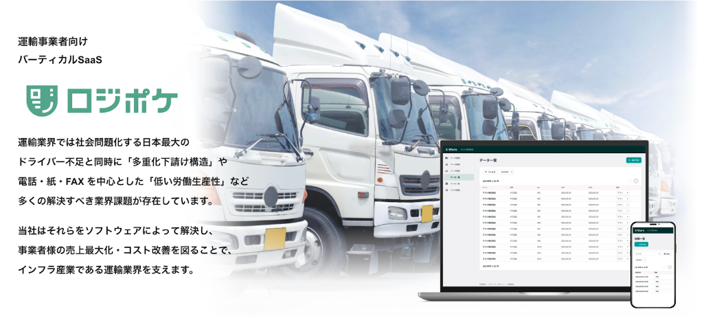 当社は『令和を代表するメガベンチャーを創る』をミッションに物流業界に特化したSaaS・プラットフォームを展開するSaaS事業「ロジポケ」、ノンデスク事業者向けのHRプラットフォーム「クロスワーク」や物流領域・建設領域に特化したエージェントの「ドライバーキャリア」「建職キャリア」等を運営するHR事業など、ノンデスク産業特化の経営プラットフォームを展開しています。