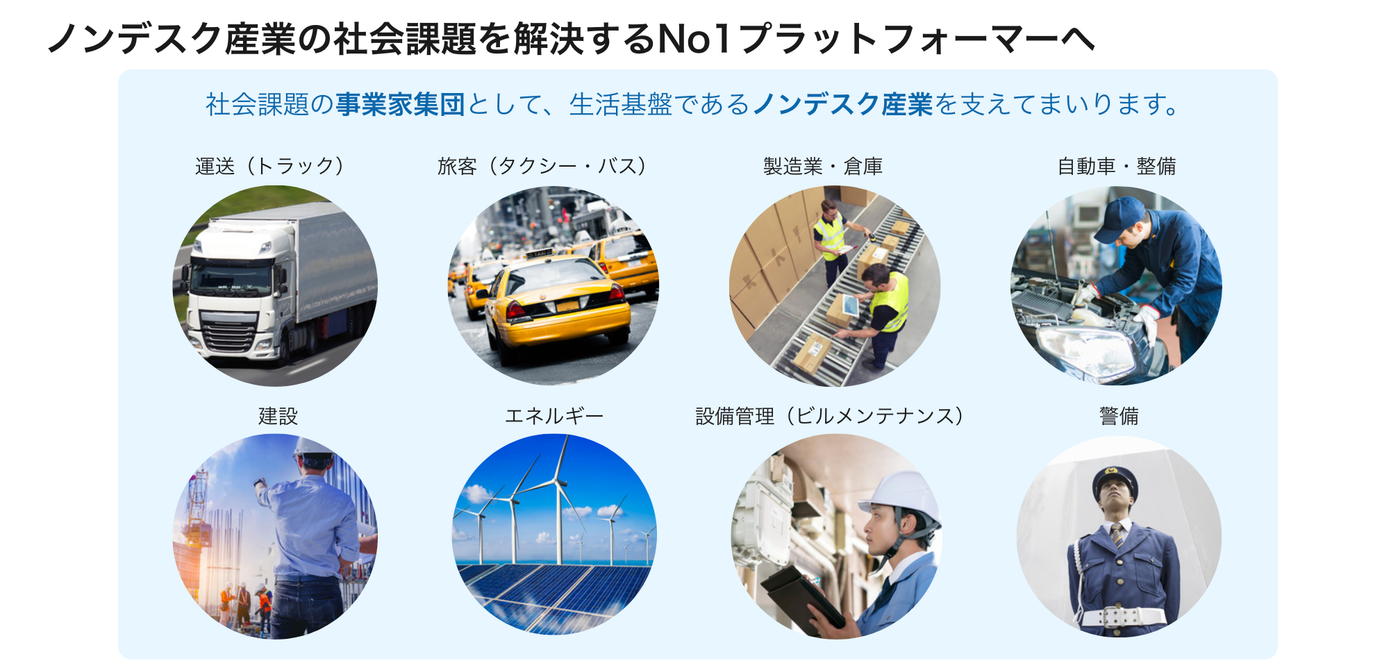 日本の生産人口は、今後20年間で1428万人減少すると予想されています。特に人手不足が深刻な職種はドライバー、建設作業者、警備員、といった「ノンデスクワーカー」です。ノンデスク産業において顕在化している問題は、「働き手の不足・労働生産性の低さ」の大きく2点です。現在私たちは双方の課題解決へ向けた取り組みを進めています。