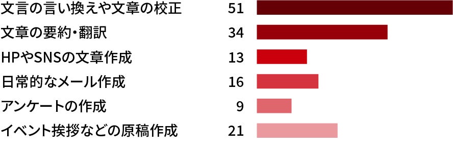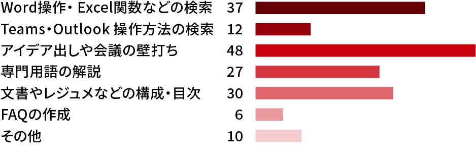 チャットボットを実際に利用した区職員127名を対象にしたアンケート結果によると、生産性の向上を実感した区職員が73%にものぼりました。通常業務では1日平均約34分の削減、アイデアや企画の素案作成については1回の処理につき平均約77分削減したと回答されました。役に立った主なケースについては以下の通りです。