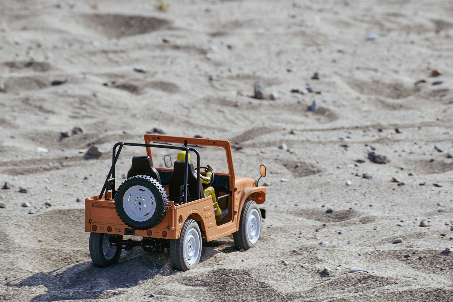 1970年代に登場したスズキ ジムニー (SJ10)は、2ストロークエンジンが奏でる独特のサウンドと小回りの利くボディで、庶民にも手が届く軽自動車ながら、優れた走破性と堅牢性を兼ね備えた名車です。その無骨で愛嬌のある「スタイル」、どこへでも行ける気にさせてくれる「機動性」そして何よりも心をくすぐる「遊び心」をRCカーモデルで余すことなく再現しました。
