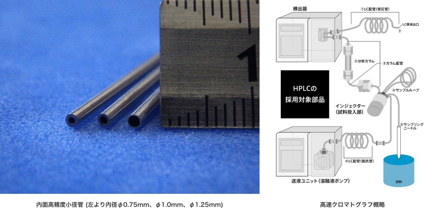 ※キャピラリー(capillary)とは中空細管の総称で、特に内径の小さい管を指します。例えば、高速液体クロマトグラフィー(HPLC)やガスクロマトグラフィー(GC)などの分析機器において、分析カラム管と圧力ポンプや検出器を繋ぐ配管などに使用されており、分析機器の高性能化や高速化により、配管内径の小径化、内面の真円度や粗さの高精度化、高圧化が求められています。
