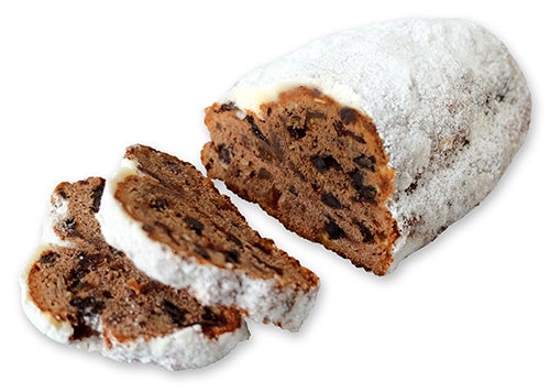 ココア生地にレーズン・オレンジ・チェリー・リンゴ・パインなどのドライフルーツとアーモンド・