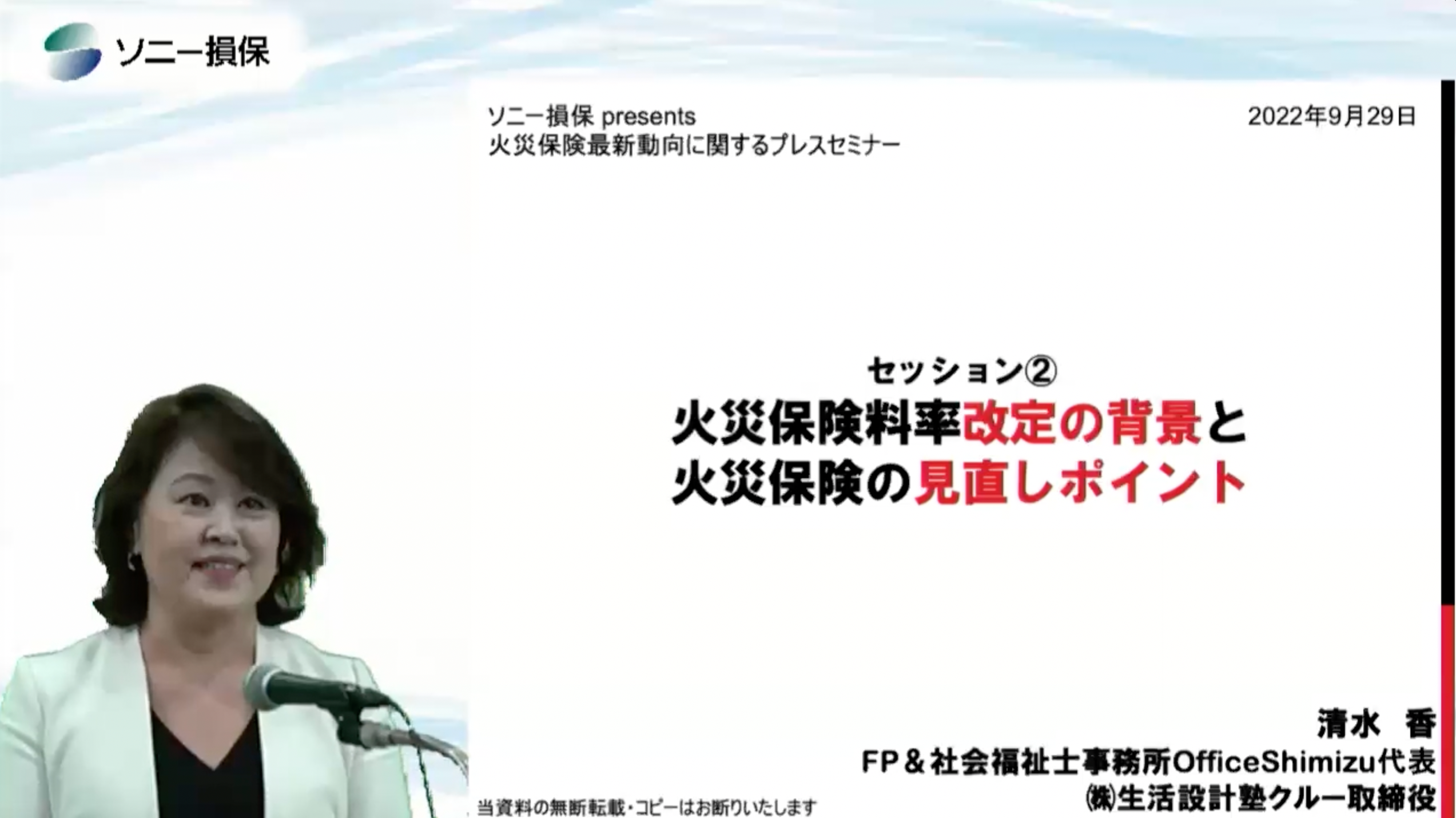 オンラインセミナーでは、FPの清水香氏が火災保険の料率改定の背景や今後の見通し、見直しのポイントついて以下のとおり解説しました。