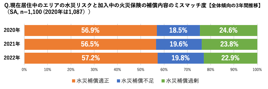 地震を除き、洪水や土砂災害、高潮リスクの有無とマンションの2階以下居住をリスクとした場合の水災リスクと補償のミスマッチ度でみると、水災補償が適正な割合は、2020年と2022年を比較すると増加傾向にあり、水災補償の過剰付帯割合も減少していることから適正な補償を選択する人が増えていることがわかります。しかし、水災補償の不足の割合は微増しており、水災害の増加によって、居住地の水災リスクの変化から補償内容が不足している家庭がわずかながら増えていることが考えられます。こうした結果からもハザードマップなどでお住まいの地域のリスクを改めて確認することが重要であるといえます。