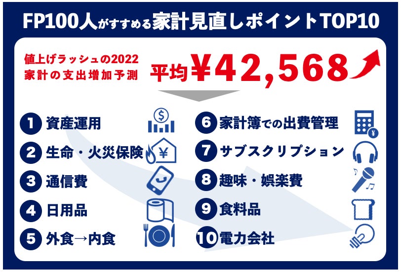 また同調査では、今後も継続すると予想されている値上げへの対策として、FPに家計の見直しの際に重要なポイントを聞きました。上位には「資産運用(株式投資やNISAなど)」のほか、「生命保険・火災保険」、「通信費」などがランクインしており、固定費の見直しを重要視する回答が多いことがわかりました。