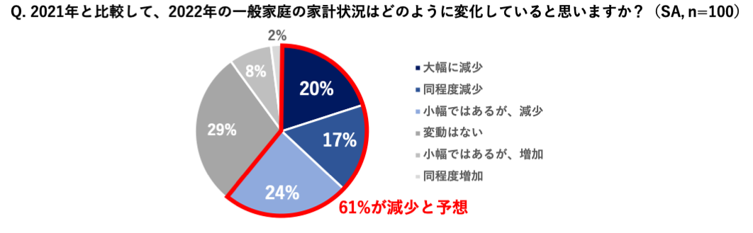 2022年5月にソニー損保が実施した全国のFP100名を対象にした家計支出や見直しに関する調査(※2)では、半数以上(61%)が2022年の一般家庭の家計状況は2021年より収入が減少していると考えていると回答し、92%が2022年下半期も値上げの傾向は続くと答えました。
