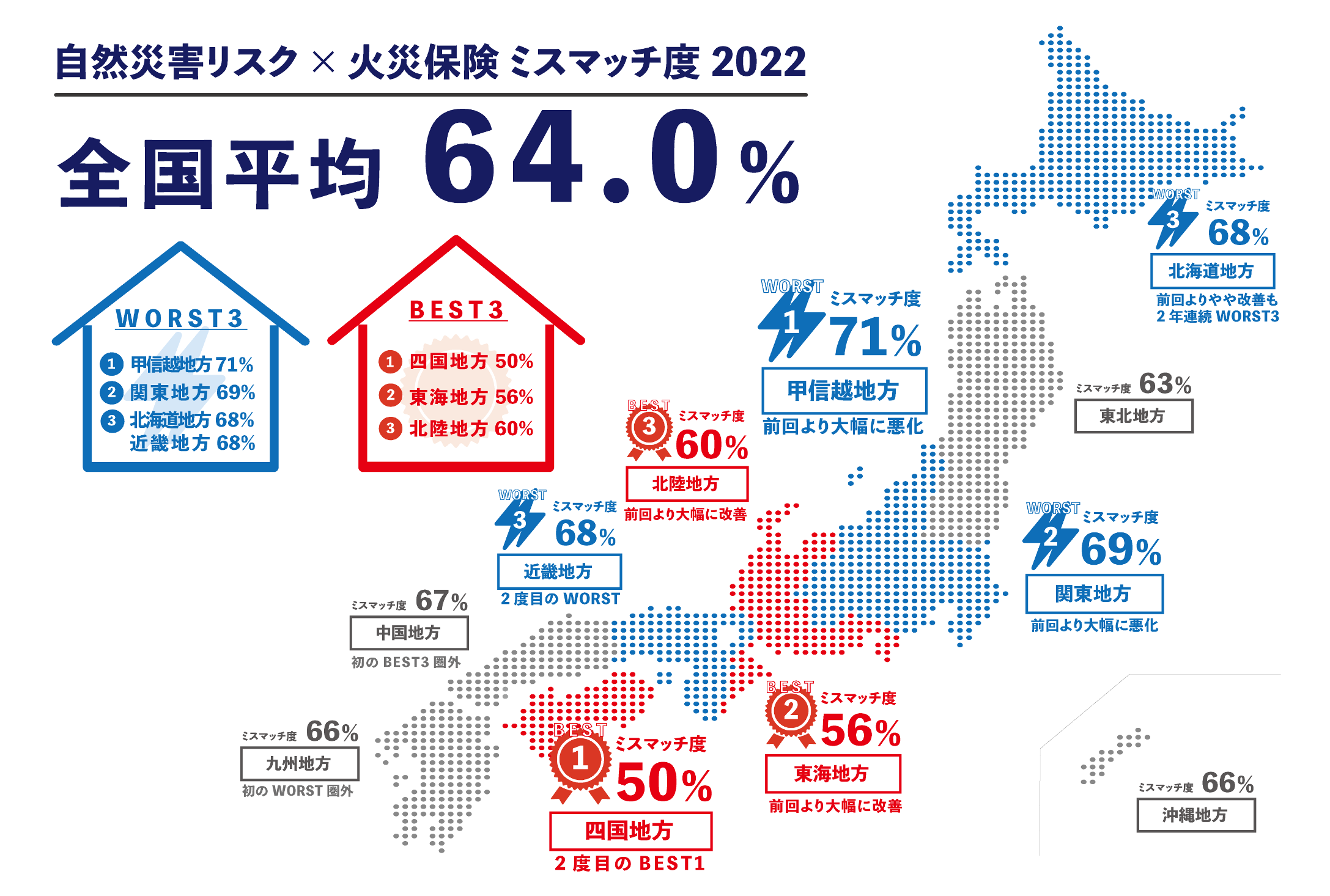 2022年9月にソニー損保が発表した全国1,100の持家家庭を対象にした、災害リスクと火災保険に関する意識調査(※3)では、居住エリアの自然災害(水災・地震)リスクを「国土交通省わがまちハザードマップ」等で確認し、加入している火災保険の補償内容と比較することでリスクと補償のミスマッチ度を計算。その結果、全国のミスマッチ度は2020年は67.2%、2021年は65.6%、2022年は64.0%と3年連続で6割以上の世帯で自然災害リスクと火災保険の補償内容のミスマッチが発生しているという結果が出ています。