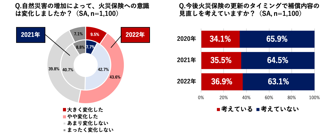 さらに、火災保険加入者の3人に1人が次回更新のタイミングで補償内容の見直しを考えていることが判明。2年連続で増加していることから、補償の見直しが重要であることの認知が高まっていることがわかります。