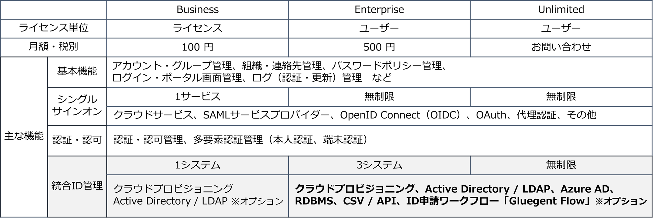 ※ ラインナップ別機能の詳細情報は、https://www.gluegent.com/service/gate/license/ をご覧ください。