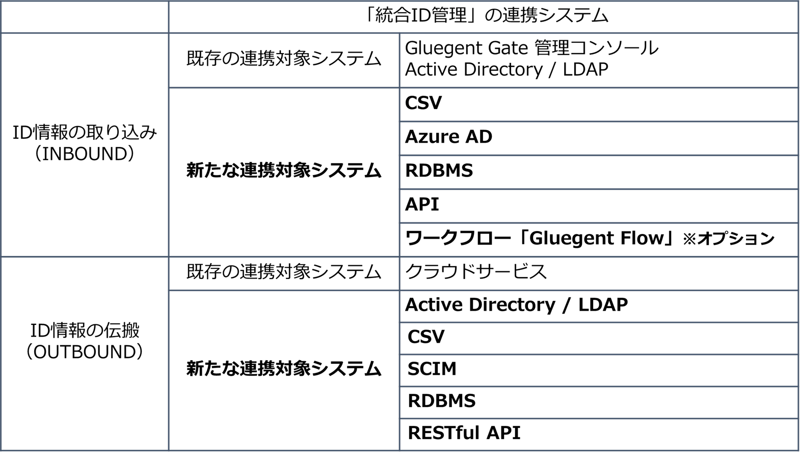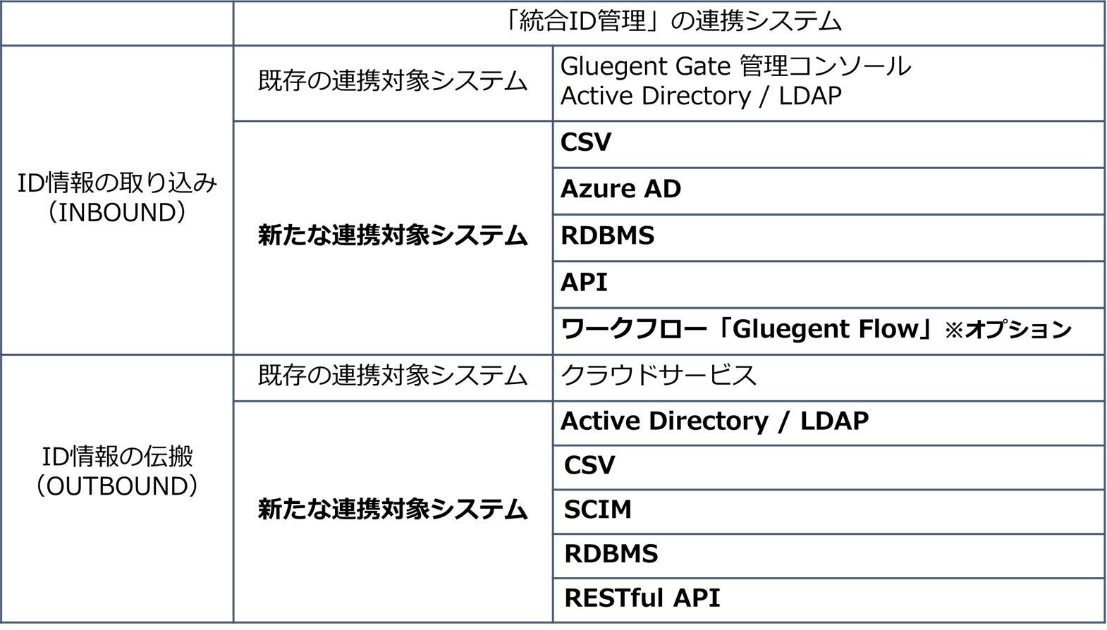 このたび、「Gluegent Gate」は、企業の認証セキュリティとIDガバナンスの強化を実現するために、オンプレミスおよびクラウドに配備するさまざまなシステムやサービスにおけるIDを統合的に管理できるよう、「Gluegent Gate」へのID情報の取り込みおよび「Gluegent Gate」から外部システムへのID情報の伝搬について、連携できるシステムを大幅に追加し、新たな「統合ID管理」機能を提供することとしました。