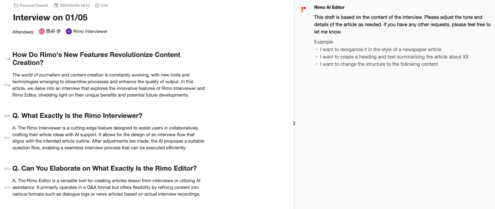 “Talk Today, Publish Tomorrow.”(「今日の取材、明日発信。」)をコンセプトに執筆に特化して開発したサービスで、インタビューを実施しその内容を記事化するまでの一連の工程をAIがサポートします。