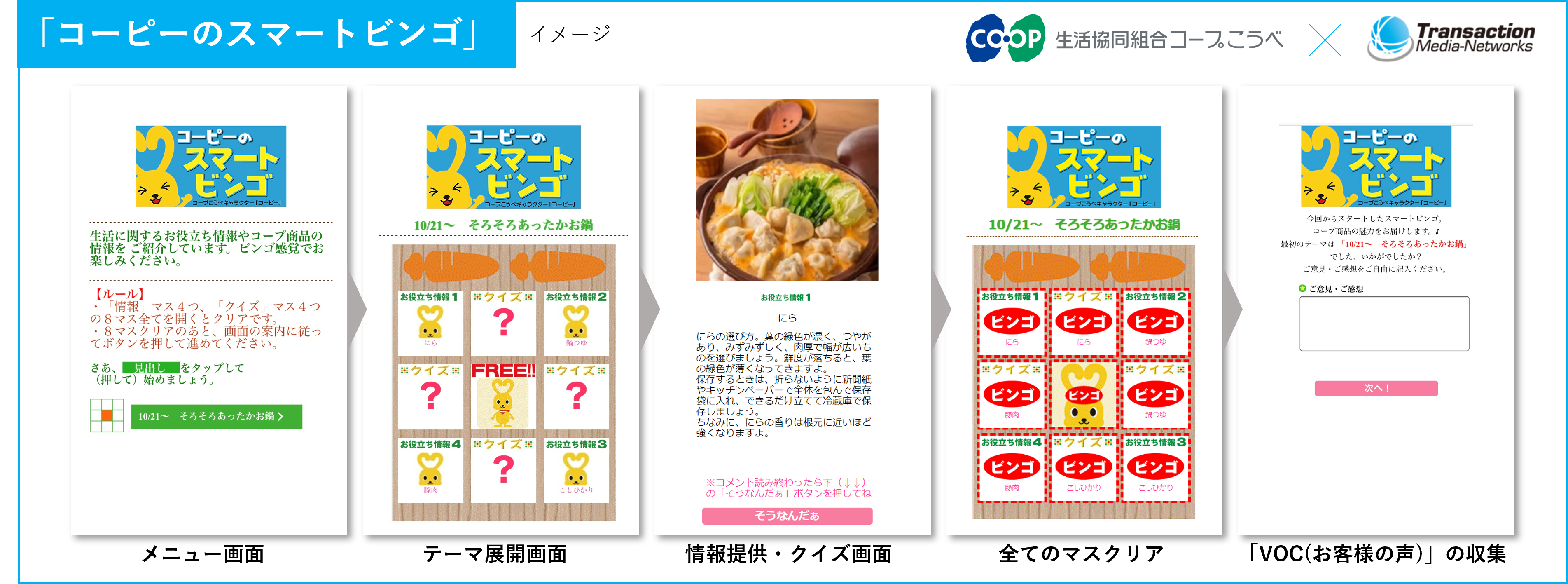 情報プロセシング事業とキャッシュレス決済サービス事業を推進する株式会社トランザクション・メディア・ネットワークス(本社:東京都中央区、代表取締役:大高 敦、以下:TMN)は、生活協同組合コープこうべ(所在地:兵庫県神戸市、組合長理事:岩山利久、以下:コープこうべ)に、TMNのビンゴ型マーケティングツールの試行導入を開始しましたのでお知らせいたします。