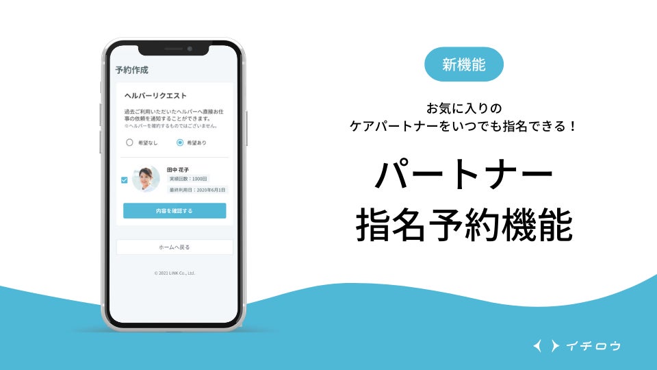 株式会社LINK(本社:東京都渋谷区/代表取締役:水野友喜/以下当社)は、当社が提供するオーダーメイドの介護サービス「イチロウ」(以下イチロウ)において、過去に利用したお気に入りの介護士へ直接指名をして予約をすることができる指名予約機能をリリースしたことをお知らせします。