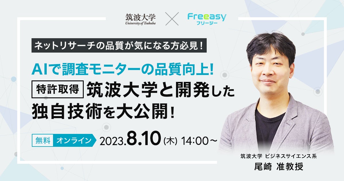 今回は、特許取得を記念し、ネットリサーチの品質が気になる方に向けて、Freeasyのアドバイザーにも就任いただいている筑波大学の尾崎准教授から、共同研究やAIに関して解説していただきます。