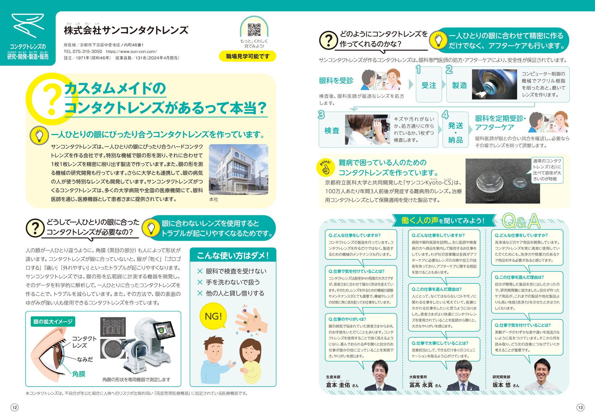 自社製品として、一人ひとりの眼に合ったカスタムメイドコンタクトレンズ、希少疾病用コンタクトレンズが紹介され、社員へのインタビューも掲載されています。
