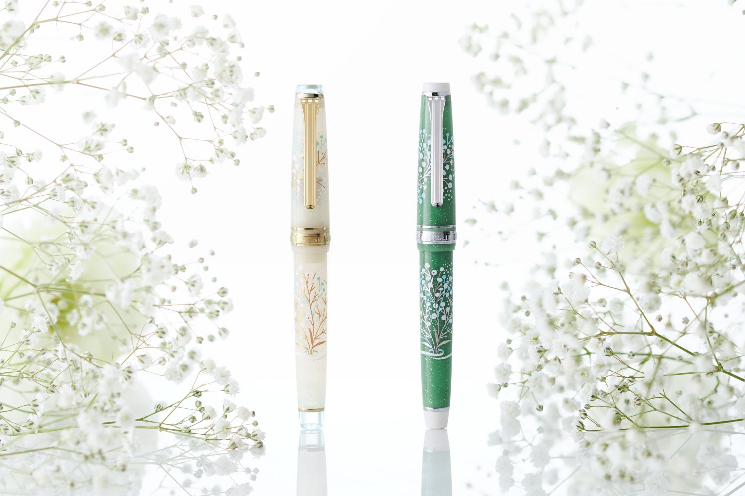 プロフェッショナルギア スリム カスミソウは、清楚で愛らしい印象が魅力のアンコーラならでは逸品。手のひらサイズのスリムなフォルム。滑らかな書き味のペン先と蓋栓にはカスミソウの装飾を。本体はゴールド/ホワイト、シルバー/グリーンの2種をご用意し、どちらもブーケを思わせるデザインが全身を彩ります。
