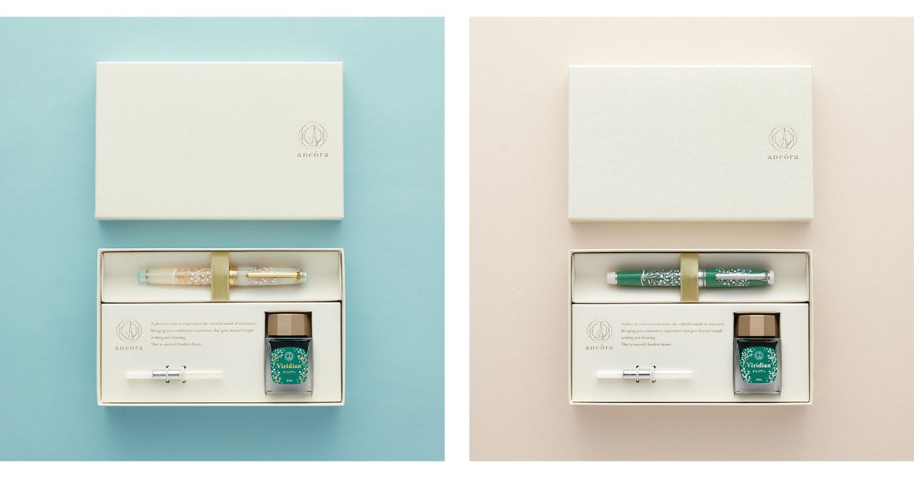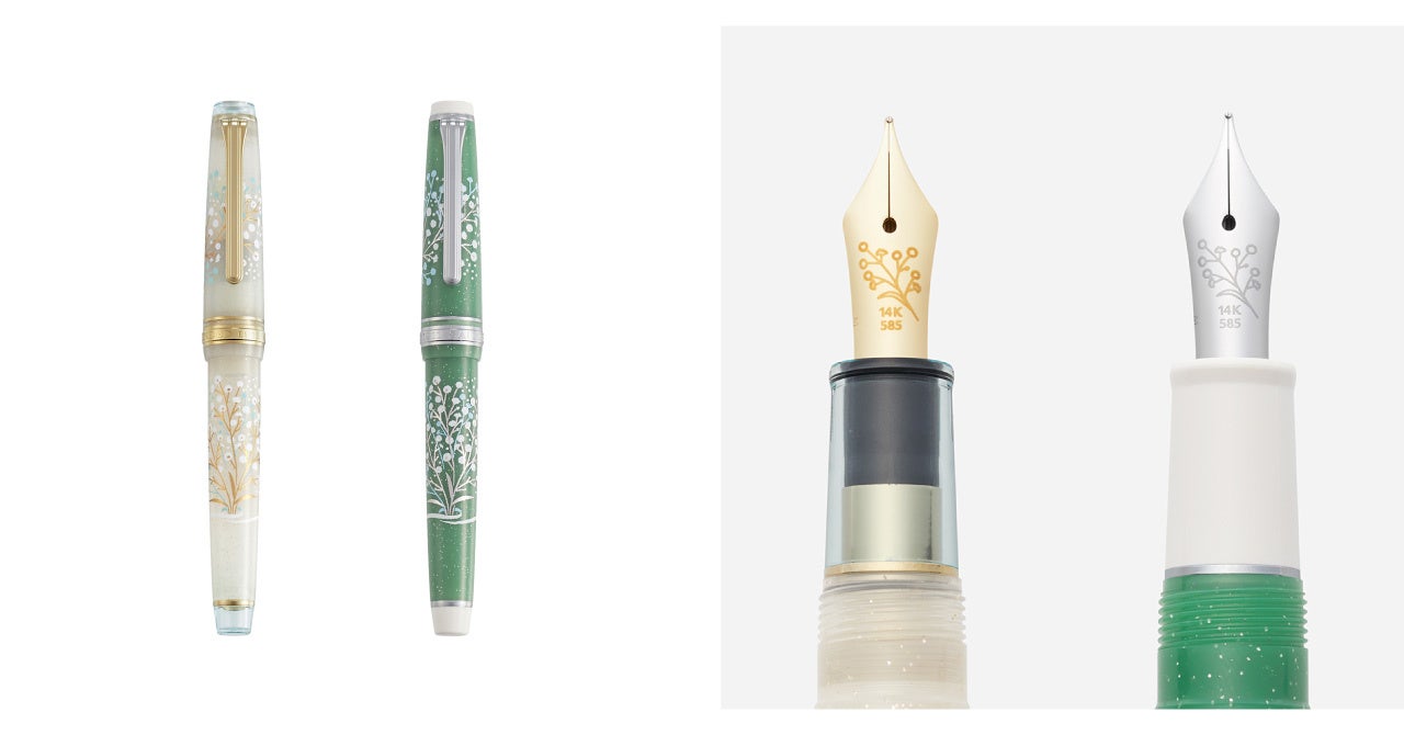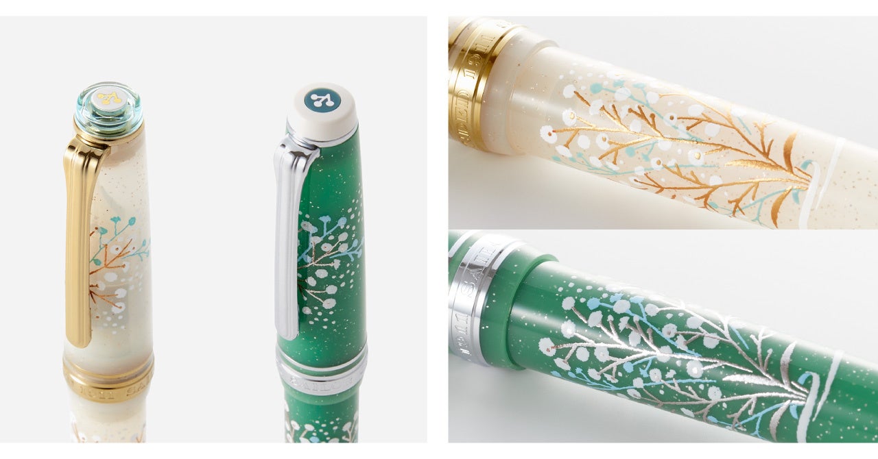 PROFESSIONALGEAR Slim Limited Edition Set Kasumiso is a sweet and charming masterpiece available only from ancōra. The pen has a slim shape and the cap top and smoothly gliding nib are embellished with baby’s breath flowers. Available in two color combinations, gold & white and silver & green, the cap and barrel are adorned with a bouquet-like motif. The set includes a limited-edition Viridian ink mixed especially for the set in the image of baby’s breath. There are seven nib sizes to choose from, ranging from Extra Fine (EF) to Music (MS).