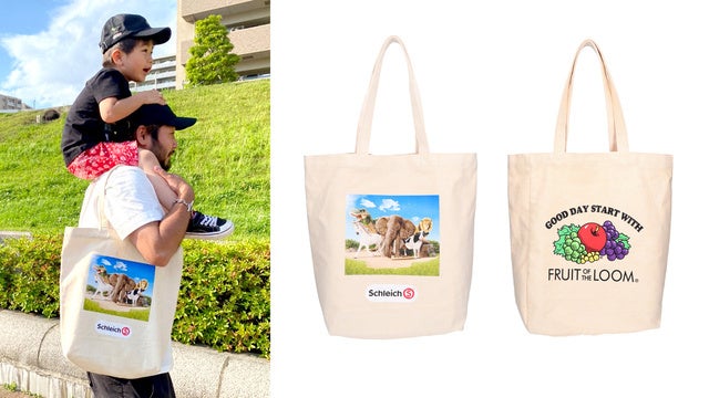 ドイツのブランド《シュライヒ》と、ベーシックアパレル/アンダーウェアの老舗ブランド《FRUIT OF THE LOOM》の商品開発が実現、大人用と子ども用の2サイズのTシャツを、マクアケ限定のオリジナルトートバックに入れてお届けします。