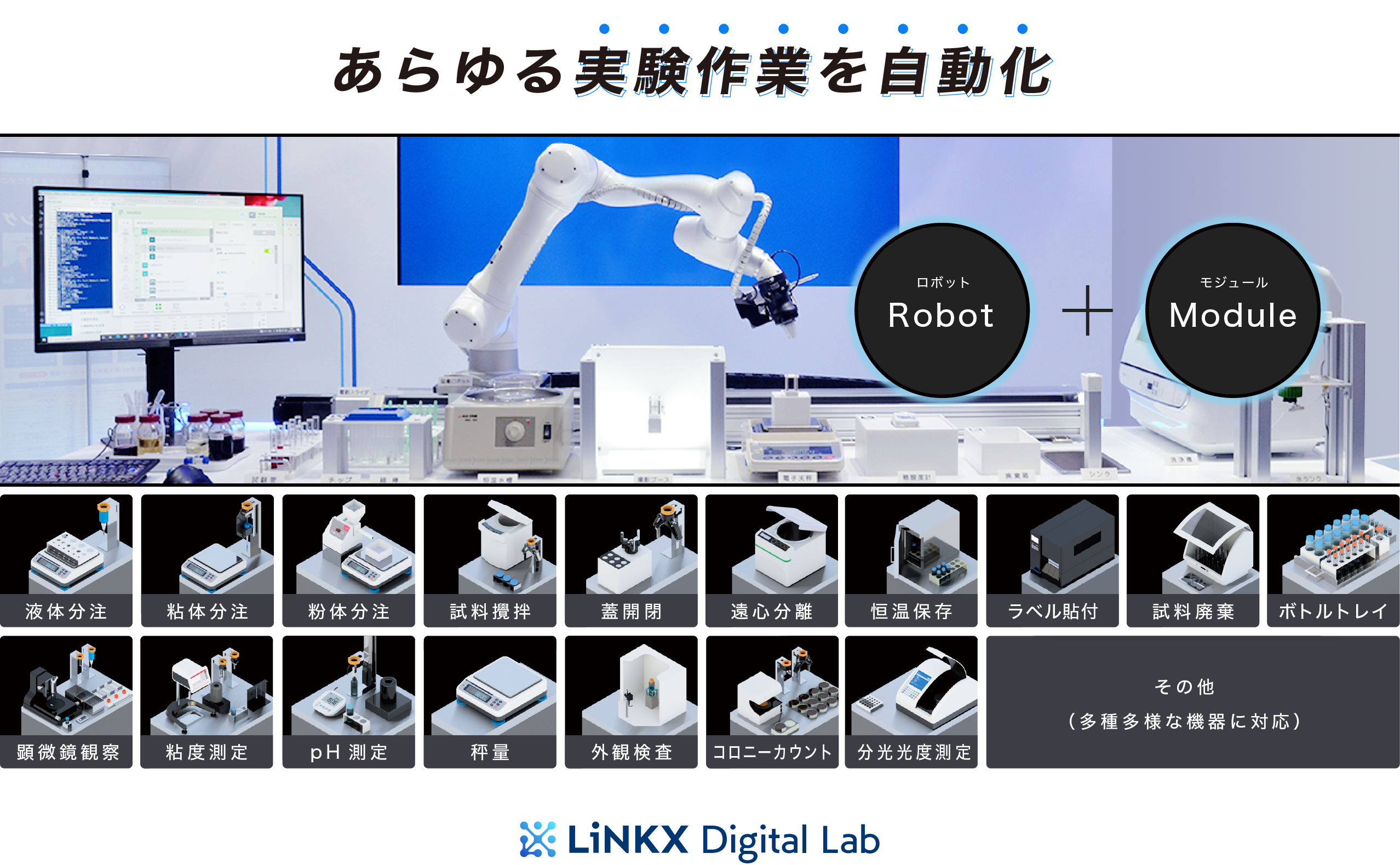 自由度の高い協働ロボットを使用することで、人が行うのと同じように複雑な前処理も自動化、また現場で使用されている計測機器/分析機器をそのままシステムに組み込むことが可能です。リンクスは、初期の自動化コンサルティングからシステム実装、運用までワンストップで対応し、将来に渡ってお客様に伴走する自動化パートナーとなります。