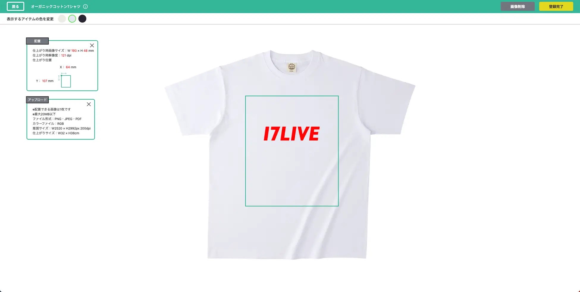 「イチナナショッピング」は、「17LIVE」上で、ライブ配信の視聴から商品購入・決済までシームレスに行うことができるサービス。今回〈Printio〉でサポートしているのは、そんな「イチナナショッピング」の新機能で、Tシャツやトートバッグなど25種類以上のグッズからご希望のアイテムを選択後、シミュレーターにPNGやJPEG、PDF形式でデザインのアップロードを行うだけで、簡単にオリジナルグッズを作成し、実際に購入者に工場から商品が発送されるところまでをトータルでサポートし、オンデマンドライブコマースを実現する部分です。