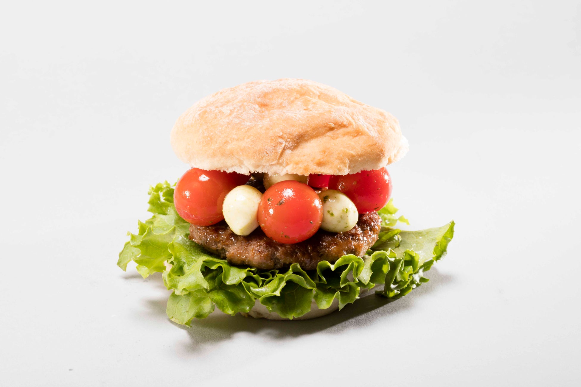 モッツアレラチーズにミニトマトを加え淡路牛最高級パテもつなぎを最小限にした超ヘルシーバーガーです。