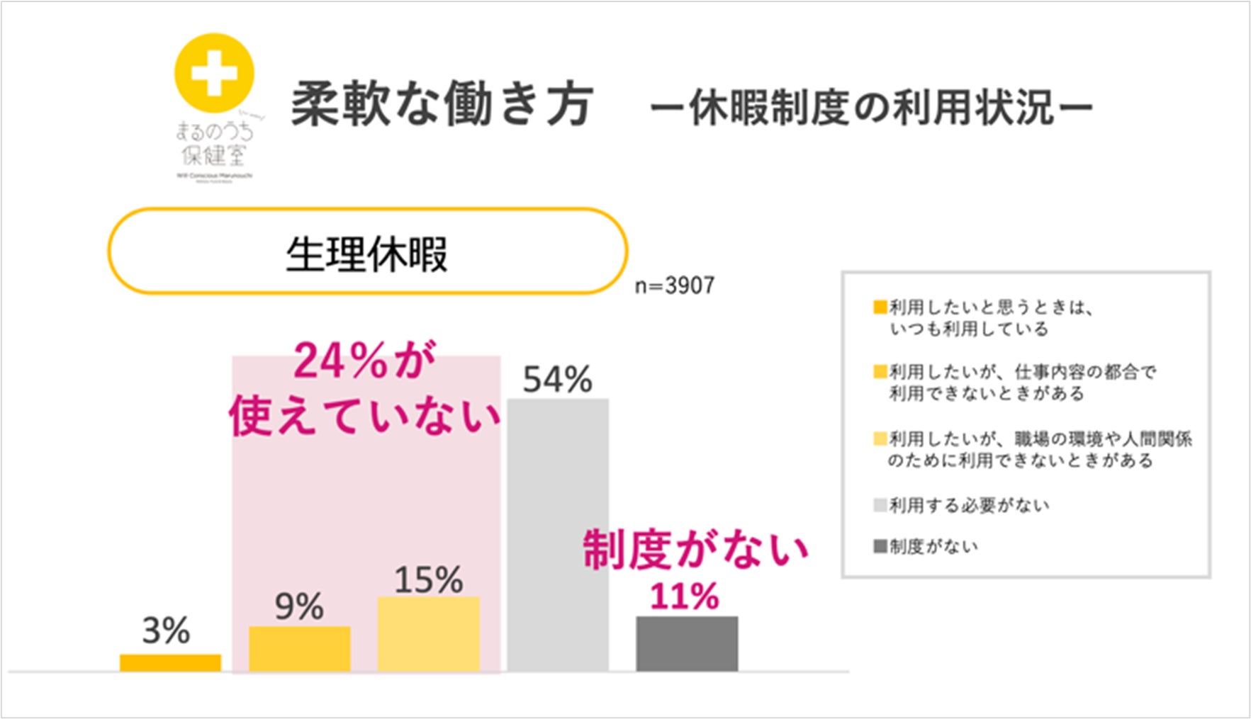 休暇制度が十分に利用できていない実態も浮き彫りとなり、特に生理休暇に対して「名前的に使いづらい」「利用している人を見たことがない」などの意見も寄せられた。男性社員による女性特有の症状への理解、頼りになる上司・同僚の存在、さらには有効的な職場の雰囲気が、心理的安全性高く女性の健康課題について会話できることにつながる。