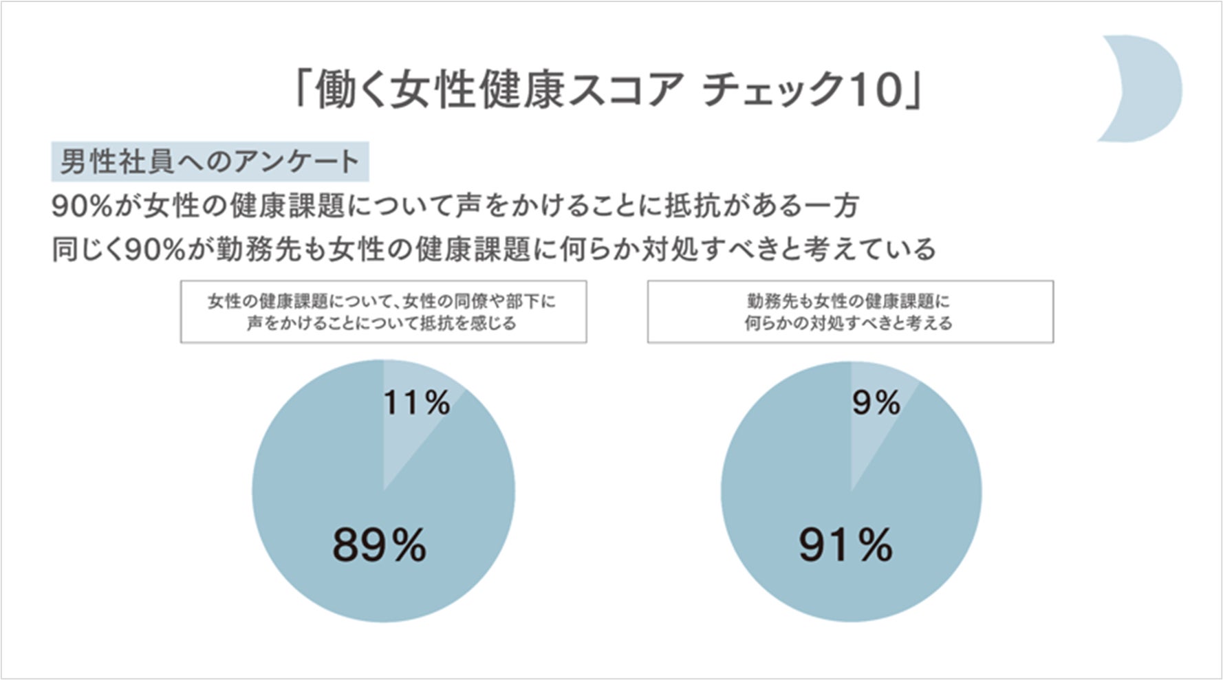 男性社員へのアンケートでは、9割が「女性の健康課題について声をかけることに抵抗がある」と回答するも、「勤務先も女性の健康課題に何らかの対処をすべき」という回答も9割という結果に。