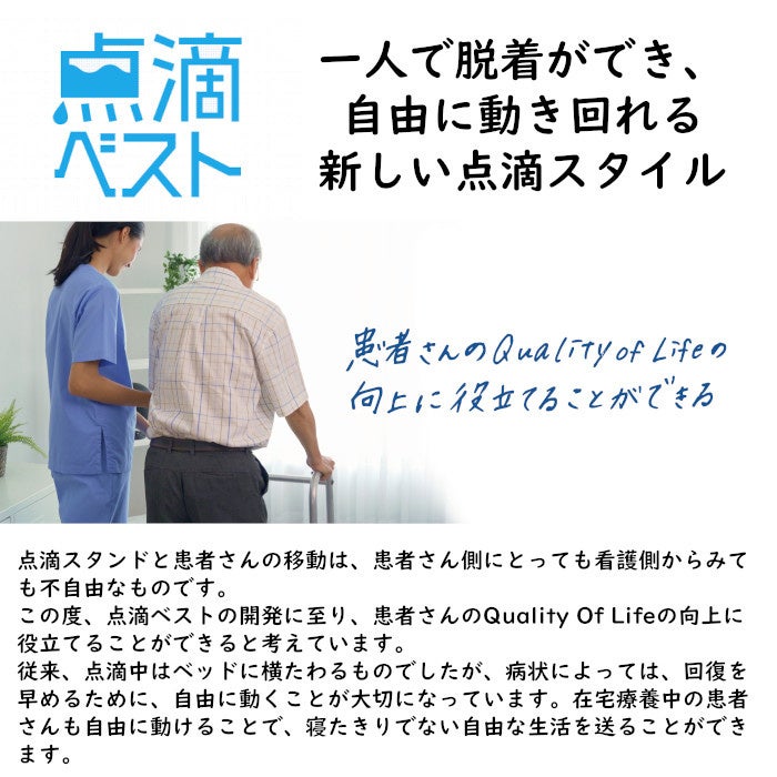 世界初!点滴時に使用するキャスター付きスタンドに代わる特許取得の点滴ベストで看護師や患者のストレスを軽減。
