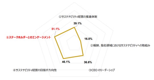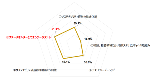5つの要素のうち、前回同様、「⑤ステークホルダーとのエンゲージメント」で最も取組みの進んだ企業が多い結果となりました。一方、「②報酬、指名領域におけるサステナビリティへの取組み」が相対的に進んでおらず、非財務指標の役員報酬制度への導入やスキル・マトリックスに基づいたサクセッションプランの策定を行っている企業が少ないことが明らかとなりました。サステナビリティに関する専門委員会との連携も含めて、報酬、指名領域とサステナビリティ戦略との連動は今後の課題である可能性があります。(図表1参照)