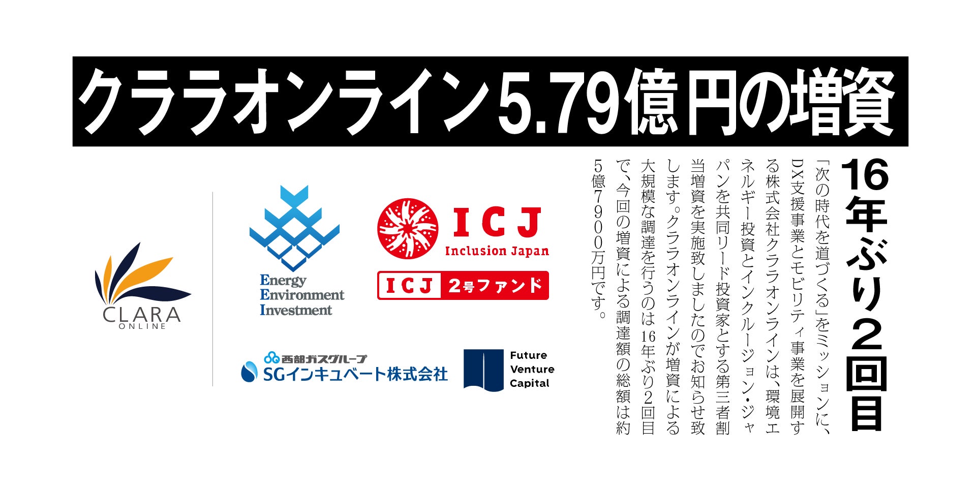 「次の時代を道づくる」をミッションに、DX支援事業とモビリティ事業を展開する株式会社クララオンライン(本社:東京都港区、代表取締役社長 家本賢太郎、以下「クララオンライン」)は、環境エネルギー投資とインクルージョン・ジャパンを共同リード投資家とする第三者割当増資を実施致しましたのでお知らせ致します。