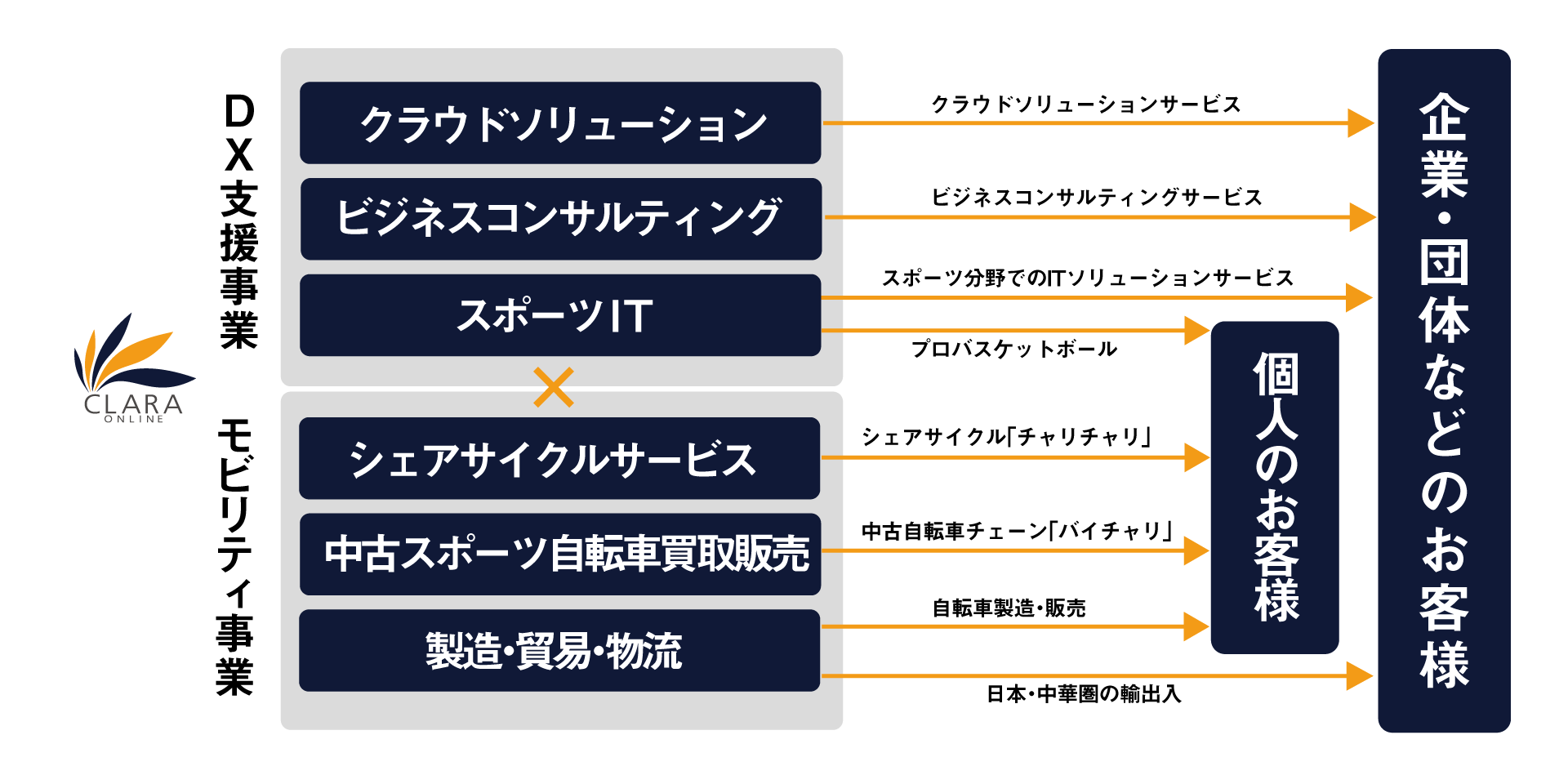 クララオンラインは、「社会のDX化を推進する企業グループ」として、課題発見×社会実装を一貫して創業からの25年間展開し続け、お客様のDXをテクノロジーの力をもってご支援するDX支援事業と、これらのDX支援事業の知見や経験を活かして移動をDXするモビリティ事業の分野を持ち、テクノロジー分野での経験を活かして人やモノの移動・自転車というリアルな分野のDX推進に自ら取り組んでいます。