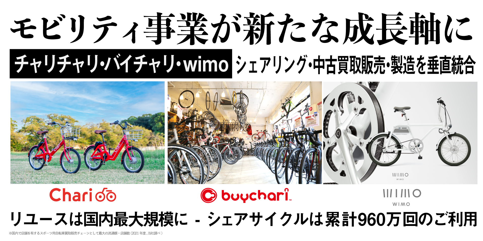 さらに、バイチャリは全国22店舗とECサイトを通じてロードバイクやクロスバイクなどのスポーツ用自転車を中心に買取販売事業を展開し、販売額の40パーセント以上をECを通じて販売するなど、リアル販売が中心の自転車販売分野におけるDXにも成功いたしました。大量販売・大量廃棄が繰り返されてきた我が国の自転車業界において、プロの目と手による整備やクリーニング、データ・テクノロジーを最大限活用して自転車の価値を繋ぎ続けるリーディングプレイヤーとして位置しています。
