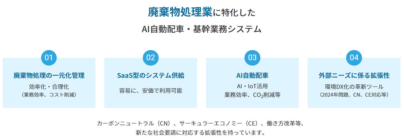 廃棄物処理事業者の毎日の配車計画をAIで自動生成するAI自動配車機能と、顧客管理、受注管理、請求管理などを毎日の基幹業務を行う機能を統合したシステムです。