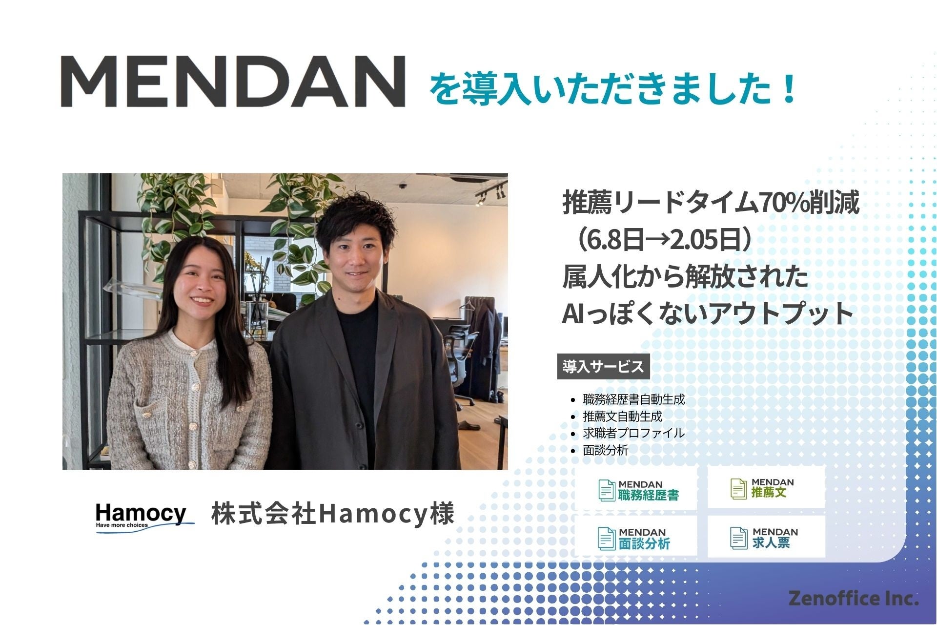 ZZen office株式会社(本社:大阪市中央区、代表取締役:岩瀬 恭裕、以下 当社)が提供する音声×AIエージェント「MENDAN」は、転職支援会社の株式会社HamocyがMENDANを導入したことで、推薦リードタイムを平均6.8日から2.05日へ70%削減し、さらに決定日数を116日から62日に短縮(最短21日で決定)した導入事例を公開しました。