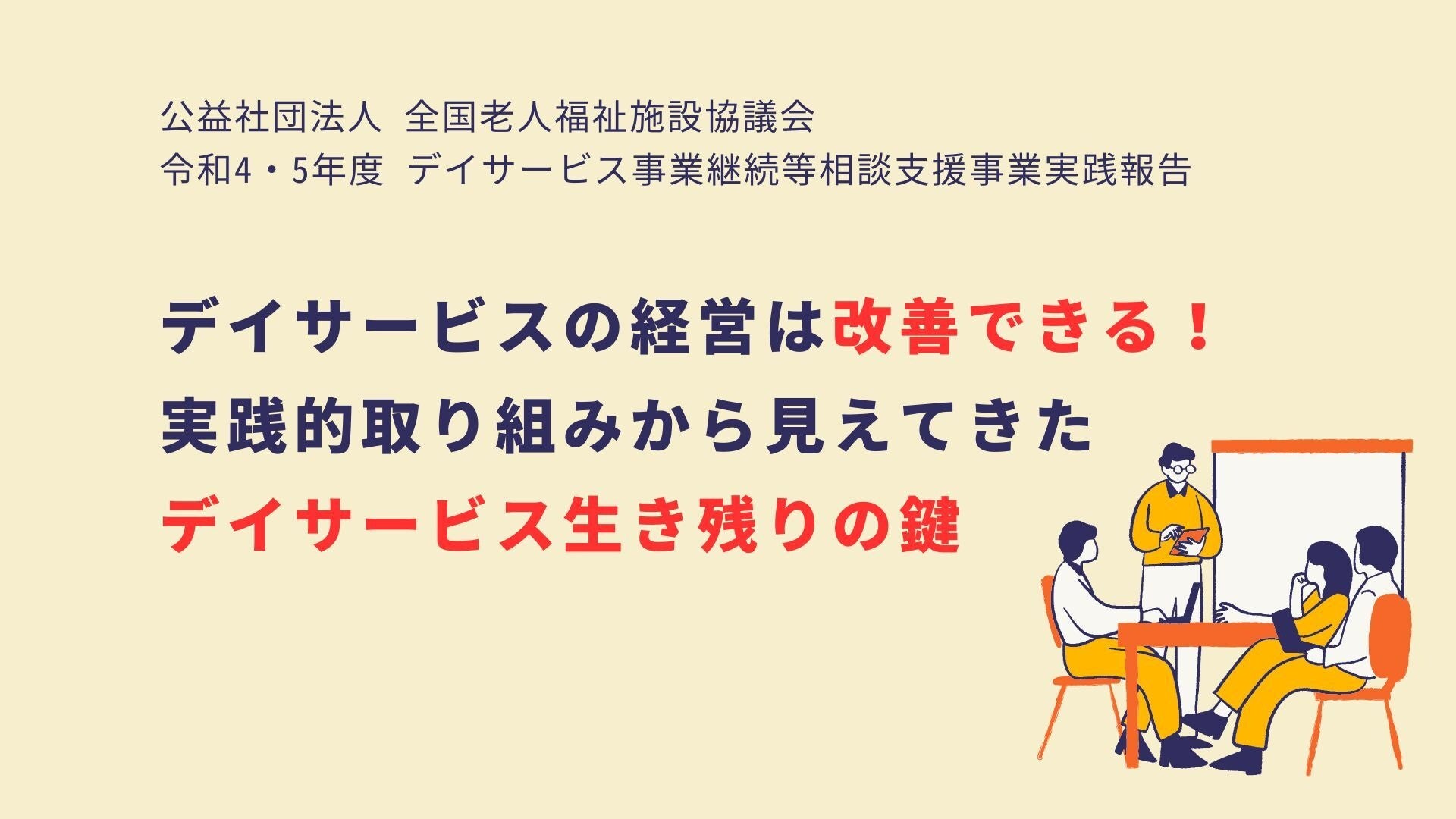 近年、少子高齢化や競争社会等を背景に事業廃止や事業休止となるデイサービスが相次いでおり、全国老人福祉施設協議会会員においても、経営改善を志しているものの、具体的な解決策を持ち合わせていない事業所がたくさんあります。