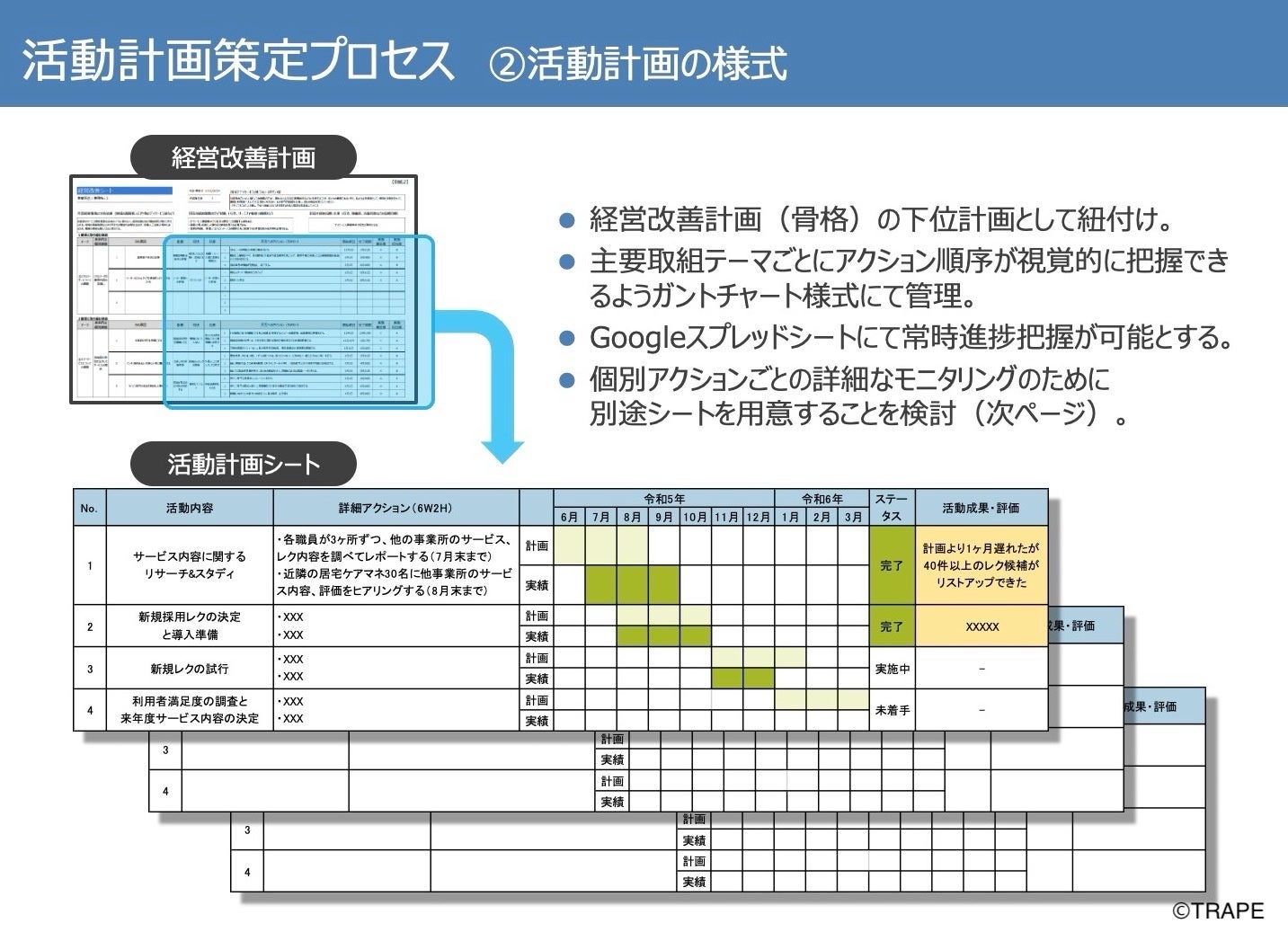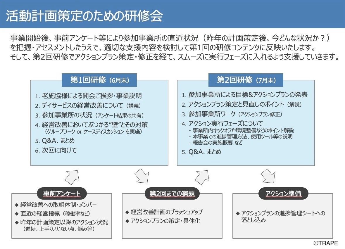 令和5年度では、令和4年度に参加事業所が策定した経営改善計画の見直しと、経営改善計画の内容を具体的にアクションできる段階にまで落とし込んだ“活動計画”を策定するために、研修会を2回実施