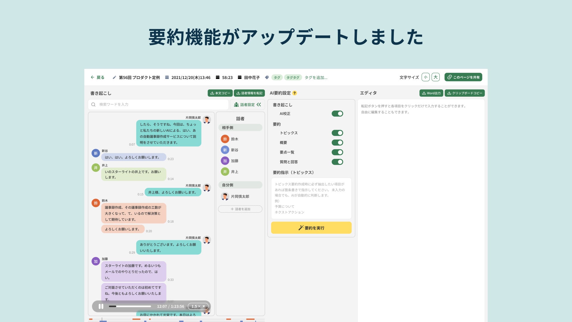 一律のAIお任せ要約では、必要な内容が欠けたり、重要でない部分が多く含まれていたりと、要約の精度に課題があるケースもありました。しかし、この新機能によりユーザー自身が必要とする要約を指定して取得できるようになります。また、新たにAI校正という機能も追加されました。これまでは、音声認識によって誤字や脱字が入ってしまいがちでしたが、AIの校正によって、より正確な日本語の書き起こしが可能になりました。