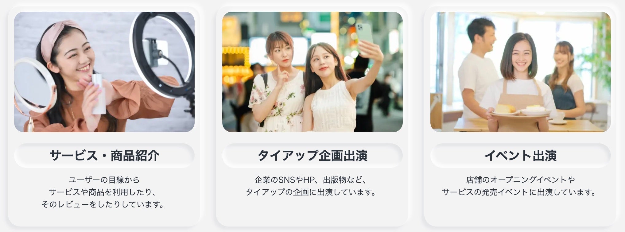 サービスや商品紹介動画を投稿してもらうことや、企業のSNSや出版物、イベントへの出演など、幅広くTikTokerを起用することが可能です。