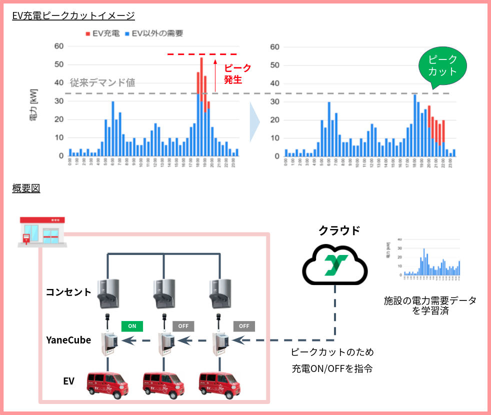 この課題を解決すべく、Yanekaraの開発したプロダクト『YaneCube』を使用し、郵便局の集配用EV車両の充電を地域の電力需要が高い時間帯から避け、電力料金のコスト抑制を図る実証実験を2022年に晴海郵便局で実施し効果を確認いたしました。